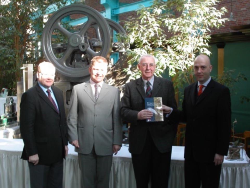 Pressefrühstück Hotel Alte Werft, v.l. Ulrich Nehe, Bürgermeister Stadt Papenburg, Hoteldirektor Erwin Fischer, Walter Remmers, Minister a.D., Olaf Trebing-Lecost (2003)